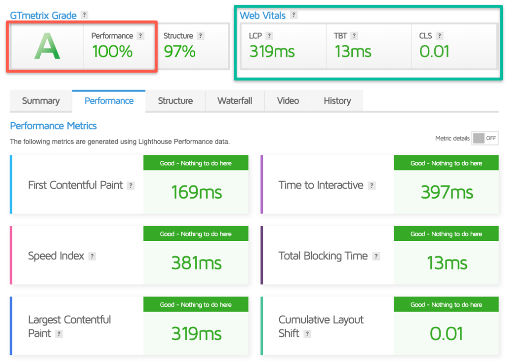 - GTmetrix Grade: A (98% performance score)