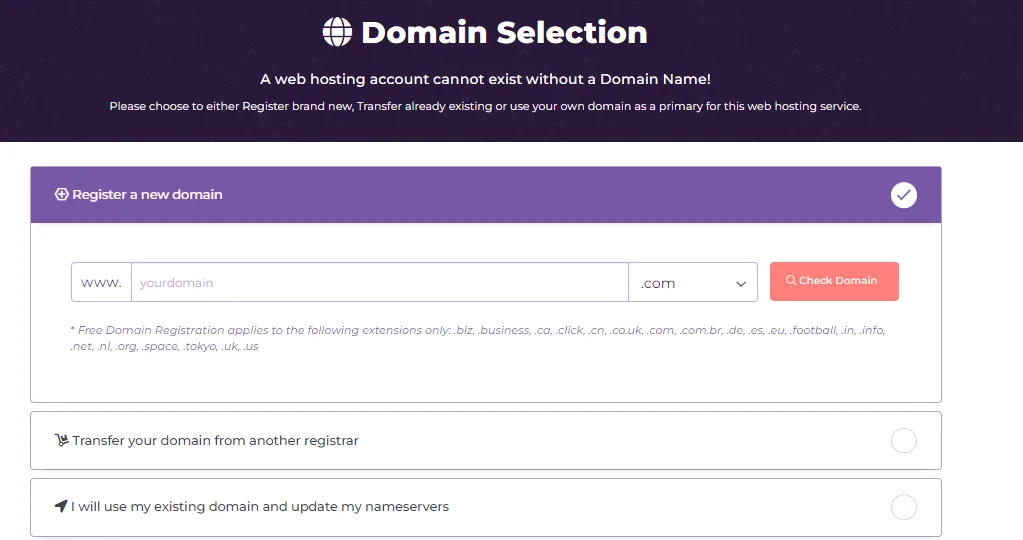 Step 3: Input the domain name you wish to register for free or provide your current domain.