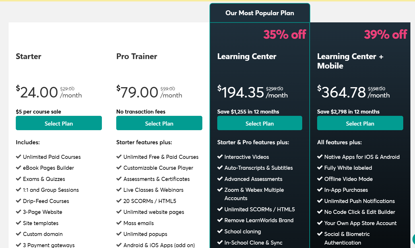 | Learning Center + Mobile | $364.78/month | $598.00/month | 39% OFF |