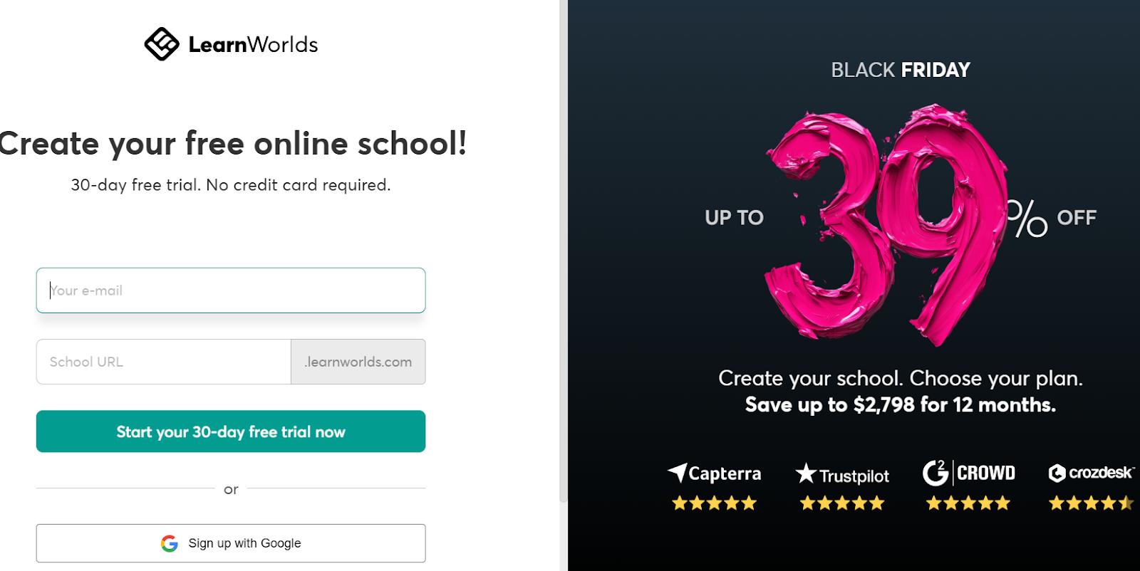 NOTE: Black Friday is the biggest sale of the year that comes with great discounts so be sure to not miss out on the LearnWorlds Black Friday Deals.
