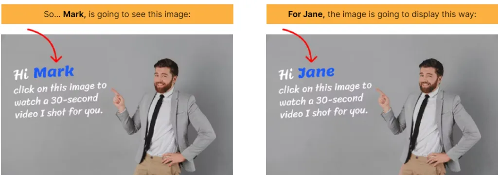 Let’s say you want this particular image to feature your prospect’s first name. In reality, it can include any attribute you want – company name, company logo, the name of his dog, whatever info you have and want to use.